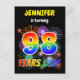 La parte delantera de este vibrante y divertido diseño de postales de invitación a la fiesta de cumpleaños incluye un nombre personalizado, un animado estallido de fuegos artificiales de celebración inspirado, y el mensaje "¡98 AÑOS!" que tiene un colorido patrón de gradiente inspirado en el espectro del arcoiris. En la parte posterior aparece un mensaje de personalizable que podría describir cuándo y dónde se está reteniendo al fiesta, además de otra información pertinente. Postales de invitación como esta podrían ser enviadas a potenciales asistentes de una fiesta de cumpleaños que se lleva a cabo para celebrar el cumpleaños noventa y ocho de alguien. [~Z0000452]
