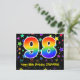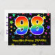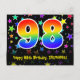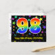 El frente de este diseño de tarjeta postal de cumpleaños emocionante, divertido y colorido presenta un gran número "98" con un patrón inspirado en gradiente de espectro de arcoíris. También presenta el mensaje "Feliz cumpleaños 98" y un nombre de destinatario personalizado. La parte delantera también cuenta con un patrón de fondo vibrante y colorido con formas de estrellas de diferentes tamaños. La parte trasera presenta un mensaje de saludo de cumpleaños personalizado, o quizás podría estar en blanco si se desea escribir un mensaje a mano en su lugar. Una tarjeta postal de cumpleaños personalizable como esta podría ser una forma divertida de enviar un mensaje que celebre el cumpleaños número noventa y ocho de alguien. Las tarjetas postales como esta también podrían utilizarse para invitar a los invitados a una celebración de cumpleaños que se celebra para alguien que cumple 98 años.