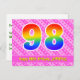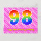 El frente de este diseño de tarjeta postal con tema de cumpleaños amoroso, animado y feliz presenta un gran número "98" con un patrón de gradiente de espectro de arcoíris, junto con el mensaje "Feliz cumpleaños 98" y un nombre de destinatario personalizable. La parte delantera también tiene un patrón de rayas rosa claro y rosa oscuro con formas de corazón. La parte trasera incluye un mensaje de saludo de cumpleaños personalizable, o quizás podría estar en blanco si se desea escribir un mensaje a mano. Una tarjeta postal de cumpleaños como esta podría ser una forma divertida de enviar deseos de cumpleaños a alguien que está celebrando su cumpleaños número noventa y ocho. Tarjetas postales como esta también podrían usarse para invitar a invitados a una celebración de cumpleaños o fiesta que se organice para alguien que cumple 98 años.
