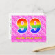 El frente de este diseño de tarjeta postal divertida, cariñosa y feliz con tema de cumpleaños presenta un gran número "99" con un patrón inspirado en gradiente de espectro de arcoíris. También presenta el mensaje "Feliz cumpleaños 99" y un nombre de destinatario personalizado. La parte delantera presenta además un patrón alegre a rayas rosa oscuro y rosa claro con formas de corazón. La parte trasera presenta un mensaje de saludo de cumpleaños personalizado, o quizás podría estar en blanco si se desea escribir un mensaje a mano. Una tarjeta postal de cumpleaños personalizable como esta podría ser una forma divertida de reconocer el cumpleaños número 99 de alguien. Las tarjetas postales como esta también podrían utilizarse para invitar a los invitados a una celebración de cumpleaños o fiesta que se organice para alguien que está cumpliendo 99 años.