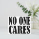 Las letras grandes, audaces y negras delinean la fría y dura verdad. A nadie le importa. Diseñado para personas que no pueden soportar quejarse, quejarse, chismorrear, alardear o conversaciones tipo TMI. ¿A quién le importa? Bueno...... nadie.