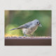 A small gray-and-white tufted titmouse stands on a wooden railing scattered with mixed birdseed, holding a single seed firmly in its beak. The softly blurred green background creates a peaceful, natural setting that highlights the bird’s delicate features and lively posture.