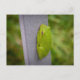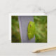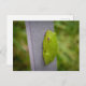 A vibrant green tree frog clings gracefully to a smooth gray metal post, its golden eye peeking out with quiet curiosity. Set against a soft, dreamy backdrop of blurred foliage, this charming scene captures a little moment of nature’s serenity—perfectly postcard-worthy.