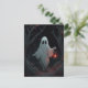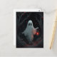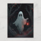The overall color palette is dark and moody, dominated by blacks, reds, and whites. The illustration employs a detailed, semi-realistic style with a focus on texture and depth, creating a haunting and immersive scene. The ghost's lantern is the only bright source of light, highlighting the eerie, mystical environment.