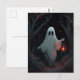 The forest is densely packed with dark, twisted trees whose branches and leaves are predominantly black and red, creating a stark contrast with the ghost's white form. Red leaves and small glowing embers float around the ghost, adding to the mysterious and supernatural atmosphere. The ground is covered with red leaves, and the path the ghost walks on is narrow and winding, leading deeper into the forest.