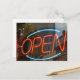 La clásica señal Open con un reflejo de la plaza Sundance (centro de Fort Worth, TX).