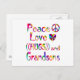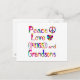 Comparte el amor por tu nieto con este diseño colorido con un signo de paz, corazón y las palabras Abrazos de amor por la paz y nietos.