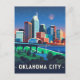 Un ilustracion cautivador de la ciudad de Oklahoma por la noche. La imagen muestra los icónicos edificios de la ciudad iluminados con un cielo estrellado, con el reflejo de las luces brillando en las tranquilas aguas abajo. El diseño evoca una sensación de tranquilidad y belleza urbana.
