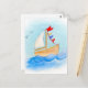Barco acuático de madera pintado de forma caprichosa, con una bandera con carácter de postal de olas de mar. Reproducida de una pintura acuarela original de Sarah Trett.