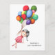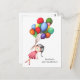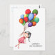 Postal de despedida con un chica de pelo negro sosteniendo muchos globos coloridos y flotando. El texto dice "Buena suerte en tu nueva aventura" pero puede ser personalizado. Haga clic en el personalizar para cambiar el tipo de letra y su color si es necesario. Ilustrado y diseñado por Patricia Álvarez.