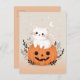 Envía saludos adorables de Halloween con esta linda tarjeta postal de Halloween que presenta un encantador gato blanco sentado en una calabaza de jack-o'-lantern naranja, rodeado de follaje. El fondo está decorado con estrellas y una luna creciente, creando una escena caprichosa de Halloween. Todo el diseño está en tonos pastel suaves, lo que lo hace perfecto para aquellos que aman una mezcla de dulce y espeluznante. Esta tarjeta postal de Halloween pastel es ideal para agregar un toque juguetón a tus mensajes de Halloween.