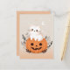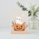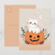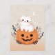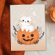 Envía saludos adorables de Halloween con esta linda tarjeta postal de Halloween que presenta un encantador gato blanco sentado en una calabaza de jack-o'-lantern naranja, rodeado de follaje. El fondo está decorado con estrellas y una luna creciente, creando una escena caprichosa de Halloween. Todo el diseño está en tonos pastel suaves, lo que lo hace perfecto para aquellos que aman una mezcla de dulce y espeluznante. Esta tarjeta postal de Halloween pastel es ideal para agregar un toque juguetón a tus mensajes de Halloween.