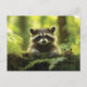 Postal Adorable mapache y rana buscando por el Mossy Log