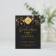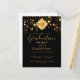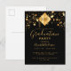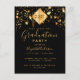 Una elegante y sencilla tarjeta de invitación para una fiesta de graduación para él y ella. Un fondo negro y un adorno superior de borla abstracta negra moderna en falso oro con el año dentro. Decorado con estrellas doradas que caen. Personalice y agregue un nombre y detalles de la fiesta. El texto Graduación y el nombre están escritos con un estilo de letra manuscrita moderna. Texto de color dorado.