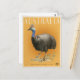 Afiche de viajes tropicales australianos de estilo retro con una caja de colores con hojas de eucalpytpus sobre un brillante fondo de sol naranja.