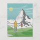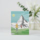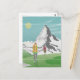 Un ilustracion vectorial del Matterhorn en Suiza. Este es el aspecto de un afiche de viaje retro. A lo lejos se puede ver un teleférico para los excursionistas que caminan hacia las montañas.