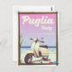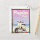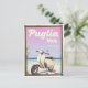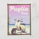 Afiche de Puglia Italy Travel, con una moto tradicional italiana en una playa de arena.