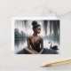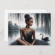 Esta postal con temática ballet presenta obras de arte de una bailarina de piel oscura sentada frente a un lago, bajo un sauce. Un cisne negro está nadando en el cuerpo del agua detrás de ella. El cuadro tiene un toque de humor con su combinación de colores a escala grisácea, excepto por el pop de piel marrón en la elegante bailarina de ballet. Está mirando hacia el costado mientras posa para este retrato de la naturaleza oscura. Ideal para los aficionados a la estética del ballet oscuro y a la estética del ballet rico en melanina.