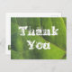 Expresa tu agradecimiento con esta postal económica que presenta una hoja verde brillante y las palabras "Gracias". La foto de la hoja verde captura el detalle de una sola hoja con líneas que se mueven en diagonal a través de la postal. Las palabras "Gracias" aparecen en el centro en letra blanca y se pueden personalizar fácilmente para adaptarse a tus necesidades. El reverso se ha dejado en blanco para dar cabida a tu toque personal de palabras o fotos.