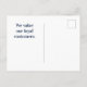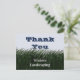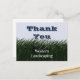 Expresa tu agradecimiento a tus leales clientes con esta económica postal promocional. La postal presenta césped verde oscuro pintado y un "cielo" azul claro. "Gracias" asoma por detrás de las hojas de césped. El nombre de su empresa aparece en fuente blanca profesional sobre el césped verde. El dorso de la tarjeta permite mucho espacio para palabras adicionales de agradecimiento que se pueden personalizar según las necesidades de su negocio.