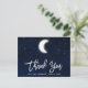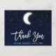 Tarjeta postal de agradecimiento de boda celestial con letra Brush Script moderna. Cielo nocturno azul con estrellas y luna en acuarela.
