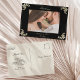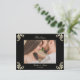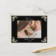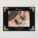Tarjeta de agradecimiento de boda barroca negra y dorada de lujo con florituras de esquina elegantes y espacio para una foto personalizada en la parte delantera. La parte trasera incluye un diseño clásico de postal con texto editable para su mensaje de agradecimiento, dirección de devolución y área de entrega. Una forma sofisticada de expresar gratitud a sus invitados mientras coincide con su suite de boda negra y dorada.