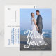 Caprichosa escritura "Gracias" superpuesta sobre la foto de su boda. Coincide con la escritura de "Guardar la Fecha" y "Guardar nuestra Fecha" con corazones. Personalice agregando sus detalles, mensaje de agradecimiento, foto frontal vertical. Utilice el mensaje de ejemplo o escriba su propio mensaje. Esta tarjeta de agradecimiento caprichosa y elegante es perfecta para bodas, graduaciones y eventos similares.