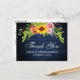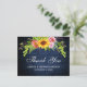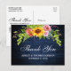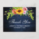 Tarjeta de agradecimiento de boda de madera azul rústica, acuarela de girasoles con rosas, peonías y vegetación