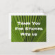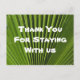Haga que la estadía de su invitado sea memorable y distinga su alquiler de vivienda de la competencia con esta tarjeta postal económica. Esta tarjeta postal promocional presenta una foto de la naturaleza que captura una hoja de palma verde brillante que muestra las profundas ranuras sombrías de esta planta tropical. "Gracias por quedarse con nosotros" se puede personalizar rápidamente si lo desea.