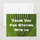 Haga que la estadía de su invitado sea memorable y distinga su alquiler de vivienda de la competencia con esta tarjeta postal económica. Esta tarjeta postal promocional presenta una foto de la naturaleza que captura una hoja de palma verde brillante que muestra las profundas ranuras sombrías de esta planta tropical. "Gracias por quedarse con nosotros" se puede personalizar rápidamente si lo desea.