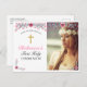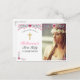 Agradezca a sus amigos y familiares por asistir a la Primera Comunión de su hija dándoles una tarjeta de agradecimiento conveniente que puede personalizar con una foto. Esta tarjeta de agradecimiento con foto de Primera Comunión presenta una hermosa cruz dorada sobre un fondo blanco clásico con flores de acuarela en rosa y azul con hojas rojas y rosadas. Escriba una breve nota de agradecimiento en el reverso, junto con su nombre y dirección de devolución para un envío rápido y fácil. Están disponibles otros tipos de letra y estilos.