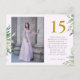 Esta elegante tarjeta de agradecimiento de quinceañera presenta una foto en la parte delantera con tipo dorado 15, incluye un dulce mensaje de agradecimiento editable y hojas de vegetación en acuarela sobre un fondo rosa pálido. La parte trasera cuenta con una segunda foto y dirección de devolución. Esta tarjeta de agradecimiento de cumpleaños número quince es editable para diversas ocasiones, o para actualizar a su propio mensaje de agradecimiento personal.