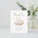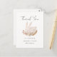 Tarjeta postal de agradecimiento del primer cumpleaños con bonito rubor que presenta un dulce conejito durmiendo en acuarela sobre una cama boho floral y de hojas. En la parte delantera hay una hermosa escritura de agradecimiento en caligrafía, y en la parte trasera incluye un mensaje de agradecimiento personalizable con dirección de remite. ¡Esta tarjeta se puede personalizar para cualquier edad del niño!