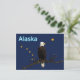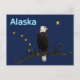 Un águila calva dispara el cielo desde su posición sobre una rama de árbol; superpuesto sobre una bandera de Alaska. El texto que dice "Alaska" también aparece en azul brillante y blanco.