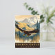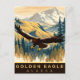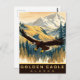 Poster del águila dorada. El pájaro vuela en el espacio abierto, con montañas detrás. Alaska, postal de viaje.
