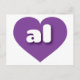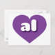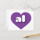 Esta postal tiene un corazón violeta vibrante que contiene las letras fundas al, negrita, blanca, redondeada y baja, una abreviatura juguetona para Alabama, el estado martillo amarillento. El reverso de la tarjeta está en blanco, esperando el texto personalizado o los sentimientos escritos a mano. ¡Marea rodante!