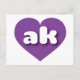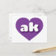 Esta postal presenta un vibrante corazón púrpura que contiene las letras negrita, blanca, redondeada, funda inferior ak, una abreviatura juguetona para Alaska, el estado fronterizo. El reverso de la postal está en blanco esperando el texto personalizado o los sentimientos manuscritos.