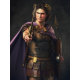 "Alejandro Magno" - Conquistador de los Imperios. Representación estilizada de Alejandro Magno. Un joven de unos veinteañeros con ojos azules penetrantes, de pie con confianza. Tiene el pelo largo, marrón claro o rubio oscuro, ondulado. Lleva un coro de bronce (placa de pan) muy bien elaborado, adornado con grabados intrincados, posiblemente con escenas mitológicas o símbolos de su divinidad. Sobre sus hombros, usa un corto y fluido manto morado (chlamys) atado con un broche de oro en el hombro derecho, simbolizando la realeza. Lleva un hoplón (escudo) y una lanza en una mano y una estilizada representación de su Kopis (espada) en la otra. Una corona de oro rodea su cabeza, simbolizando su reclamo de ascendencia divina.