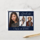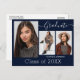 Hermosas postales de invitación de graduación de 3 fotos con escritura moderna de caligrafía en blanco sobre azul marino profundo. Para ver más artículos como este, visita mi tienda aquí en "www.Zazzle.com/LakeViewCardCo". ¡Gracias
