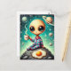 Un Alien gracioso vestido con js azules y rosas tiene café matutino y huevo