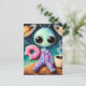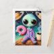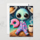 Un extraño gracioso con una rociada rosada con marcas de mordedura y con Js rosados en el espacio con una taza de café humeante
