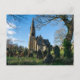 A high-resolution view of the Grade II listed All Saints Church in Salterhebble, West Yorkshire. The image captures the church’s impressive Gothic Revival spire and detailed stonework from the perspective of the historic graveyard. Framed by silhouetted tree branches against a crisp blue sky, the late afternoon sun illuminates the weathered textures of the sandstone, highlighting the architectural heritage of the Calderdale region.
