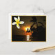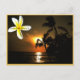 Postal de Hawái para enviar saludos de aloha con esta foto de la puesta de sol de Hawái. La luz se refleja en el agua del océano, enmarcada por palmeras. El saludo a través de la plumería blanca y amarilla dice Aloha desde Hawaii.