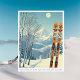Hola desde las nevadas montañas de Alyeska Resort, Alaska, EEUU! Esperamos que tengas unas maravillosas vacaciones de esquí. Esta postal cuenta con un precioso paisaje montañoso azul-gris con tablas de esquí retro en un patrón tribal naranja. Todas las frases de texto se pueden personalizar para que se adapten a su gusto.