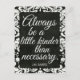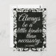 Esta elegante y elegante postal ofrece excelentes palabras de inspiración. La tarjeta postal dice: "Sé siempre un poco más amable de lo necesario". Esta es una cita de J.M. Barrie, el creador de Peter Pan. La cita se imprime en una fuente cursiva blanca sobre un fondo negro. Esta postal tiene un borde blanco y negro que incluye un patrón de damasco popular y elegante. Estos son fabulosos para profesores, consejeros de orientación y directores para dar a los estudiantes que necesitan recogerme. Como ex profesor, sé que este es el tipo de artículo que los profesores adoran dar a los estudiantes, y los estudiantes también los aman. También son excelentes para la correspondencia general. También he visto estas tarjetas de motivación enmarcadas y mostradas en paredes y escritorios de oficina. Dáselo como regalo, o manténgase para usted mismo. ¡Cómo lo quieres usar depende de ti! Las postales de Zazzle son de gran calidad y muy asequibles. La tarjeta postal mide 5,6" x 4,25" pulgadas en papel de gran calidad. Por favor, envíeme un mensaje si tiene alguna pregunta o inquietud.