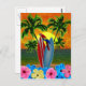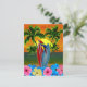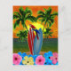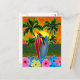 Colorida y tropical puesta de sol en el océano detrás de tablas de surf, palmeras, un loro de macao encaramado en tablas de surf y flores de hibisco en el fondo.