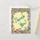 Tres ratones grises alegres le desean a su destinatario "¡Gracias!" por su consideración. Los ratones, hojas, helechos, flores y setas rojas están en un fondo amarillo claro y las palabras "¡Gracias!" están en verde azulado oscuro. Al revés hay un solo ratón con una flor en blanco. Hay mucho espacio para un mensaje escrito a mano. ¡Apropiado para cualquier ocasión u hora del año! Arte y diseño originales de Tuzi Williams.