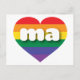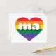 Esta postal tiene un corazón con un diseño de orgullo arcoiris y mamáes de letras blancas, negrita funda inferior, una abreviación juguetona Massachusetts, el estado de la bahía. El reverso de la postal está en blanco, esperando el texto personalizado o los sentimientos escritos a mano. Muestra tus verdaderos colores, apoya el matrimonio igualitario y celebra el orgullo gay.