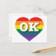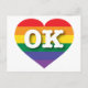 Esta postal presenta un corazón con un diseño de orgullo arcoiris y las letras mayúsculas en negrita, blancas, OK, la abreviatura oficial de Oklahoma, el estado anterior. El reverso de la postal está en blanco, esperando el texto personalizado o los sentimientos manuscritos. Muestra tus verdaderos colores, apoya el matrimonio igualitario y celebra el orgullo gay.