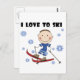 Figura de varón masculino sobre esquís, copos de nieve y texto que dice "I Love to Ski" (Me encanta esquiar) en camisetas de diseño de esquí, capuchas, sudaderas, cadenas de claves, imanes, tarjetas, pegatinas y otras prendas de esquí y regalos.